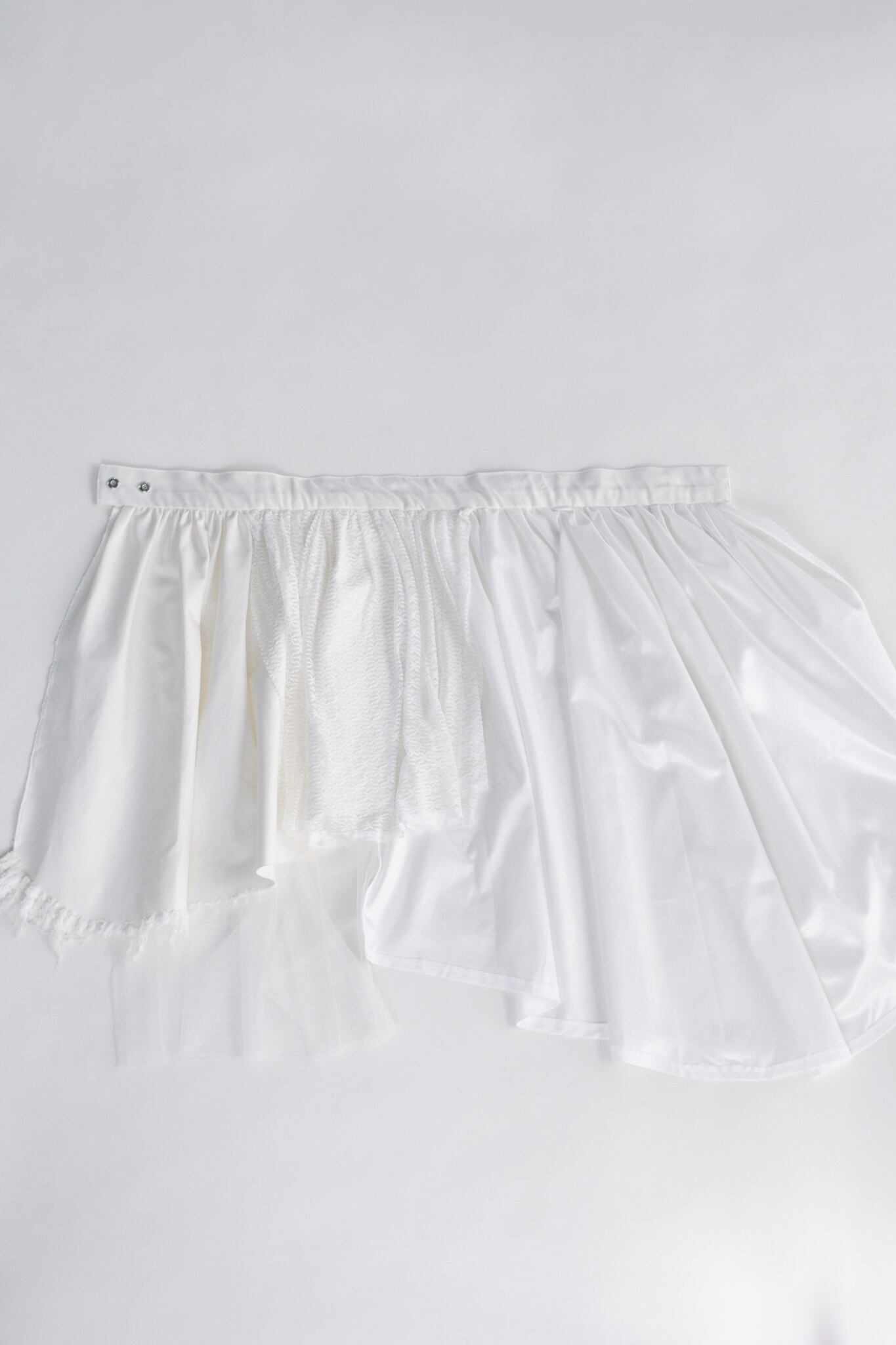 ラップスカートタイプのロングスカートで様々な生地が混在して構築されておりボリュームのあるアイテムになります。下にパンツを履いたりポンチョとして羽織ったりも可能で、バリエーションが様々です。